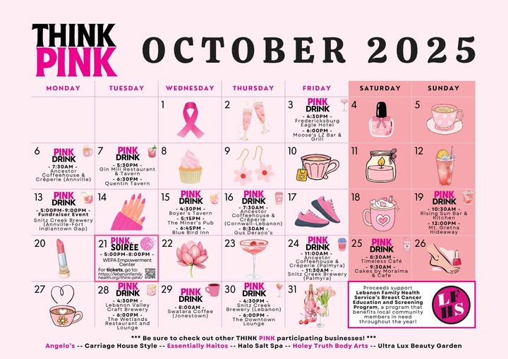 Local establishments participate by donating a portion of the proceeds from the sale of “pink” themed signature drinks, food items, services, or other pink items to LFHS in a county-wide effort to raise money and awareness for this significant cause!